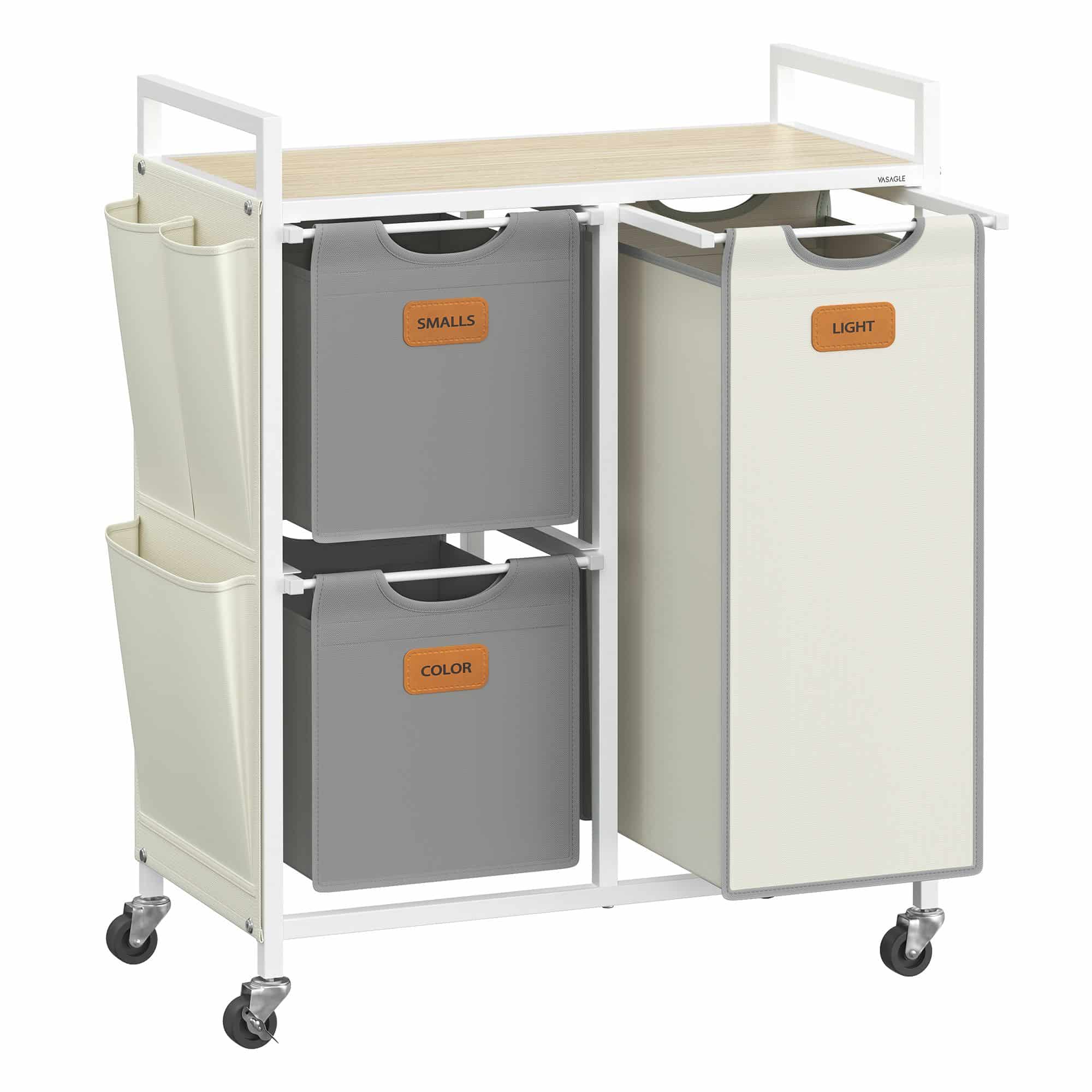 VASAGLE Wäschekorb 3 Fächer, Wäschesammler 100 L, Wäschesortierer, Rollen, Wäschewagen mit Ablage, Wäschesack, kleine seitliche Taschen, 6 Etiketten, naturbeige-taubengrau-cremeweiß BLH202G01